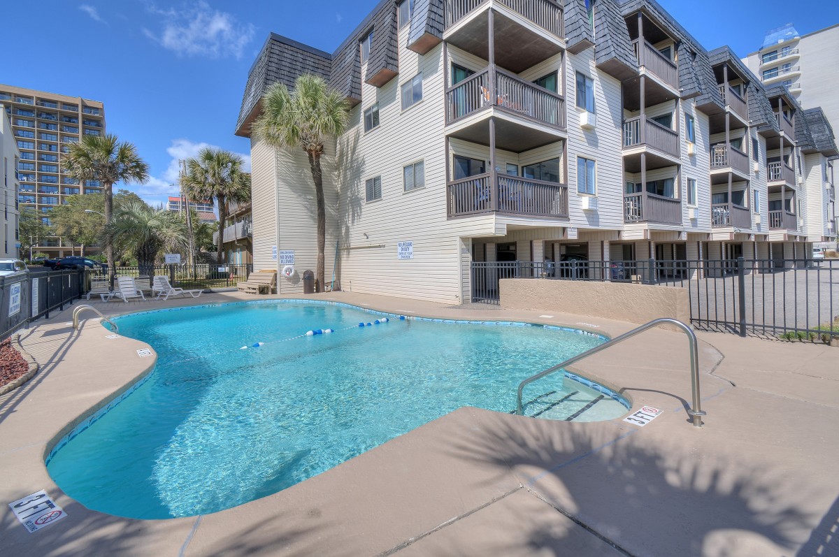 Step out onto the private balcony, and you will see why people visit Myrtle Beach every year. The Atlantic Ocean is magical and majestic, especially from this vantage point. You will also have this same view from the main bedroom. Don’t let bad weather keep you from enjoying the great ocean view, even during storms or cold weather. Walk down and check out the amenities, including an outdoor swimming pool. An outdoor shower is provided for rinsing off before hopping into the pool.