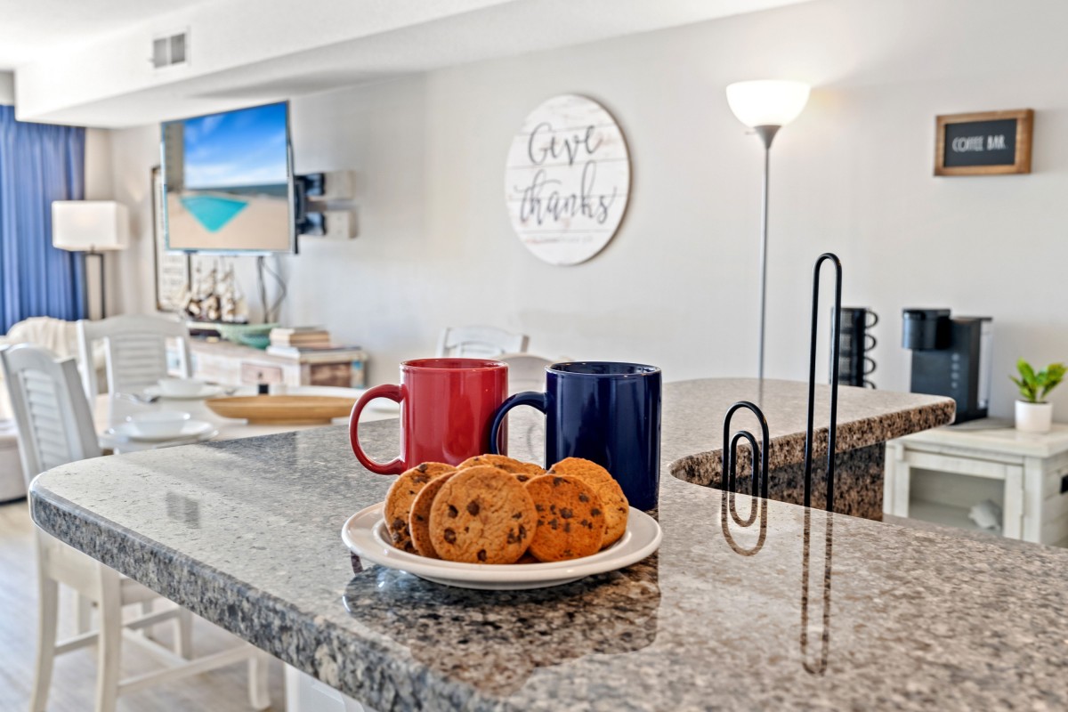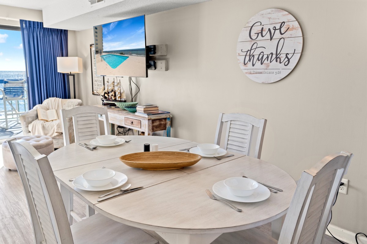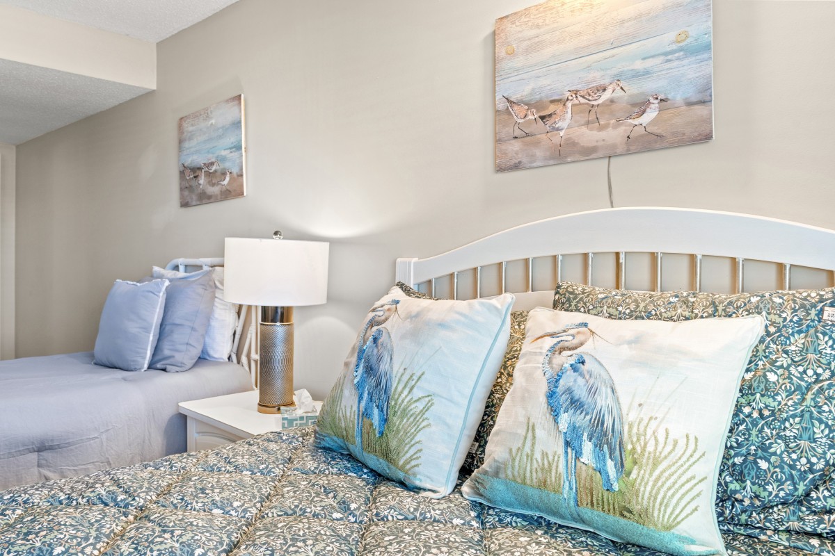 The fully equipped kitchen opens to the dining area and living room, and the breakfast bar is a wonderful place to serve snacks to the kids when you are on vacation. The soothing color scheme of this oceanfront condominium is phenomenal, and its close proximity to the swimming pool deck and beach access is fantastic.