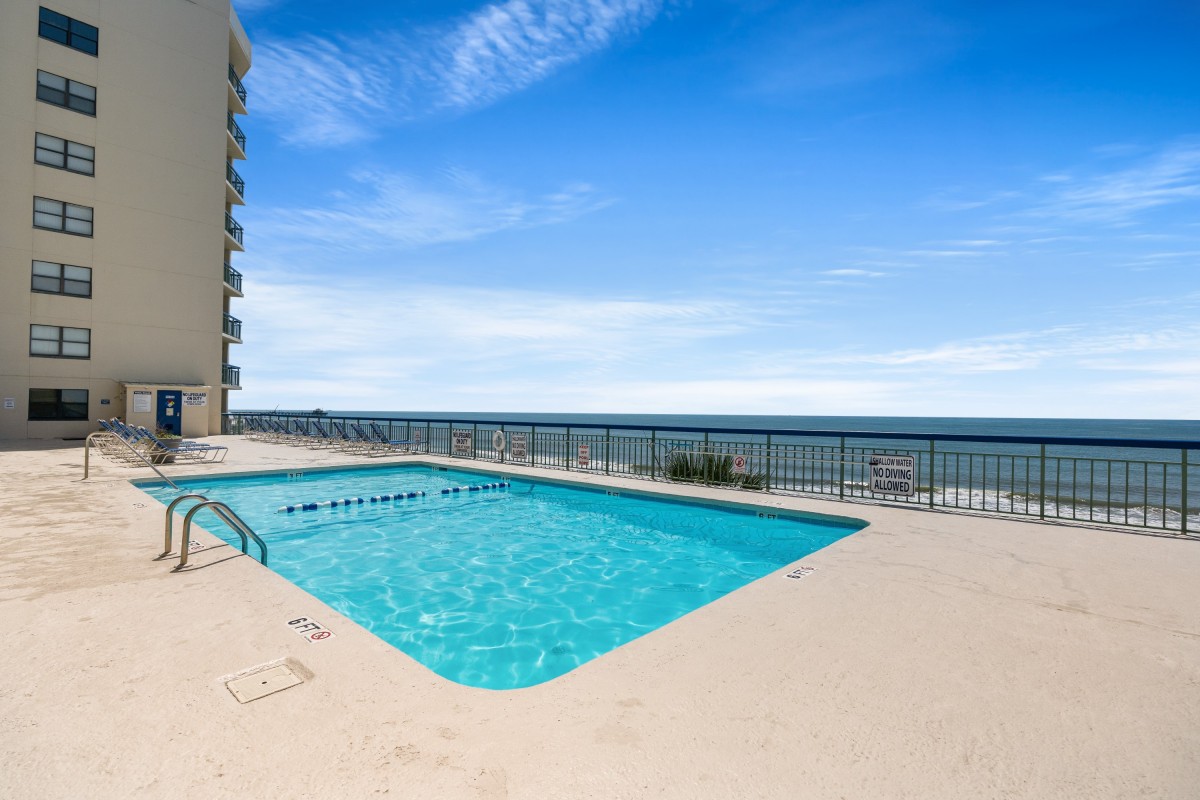 Watch the Atlantic outside your door when you choose Oceans 415, an oceanfront rental vacation condo in the Cherry Grove section of North Myrtle Beach. Located on the fourth floor where the pool is, you can easily slip right out the door and into the relaxing water or spread your soft beach towel on a waiting lounger and soak up all the Carolina sunshine.