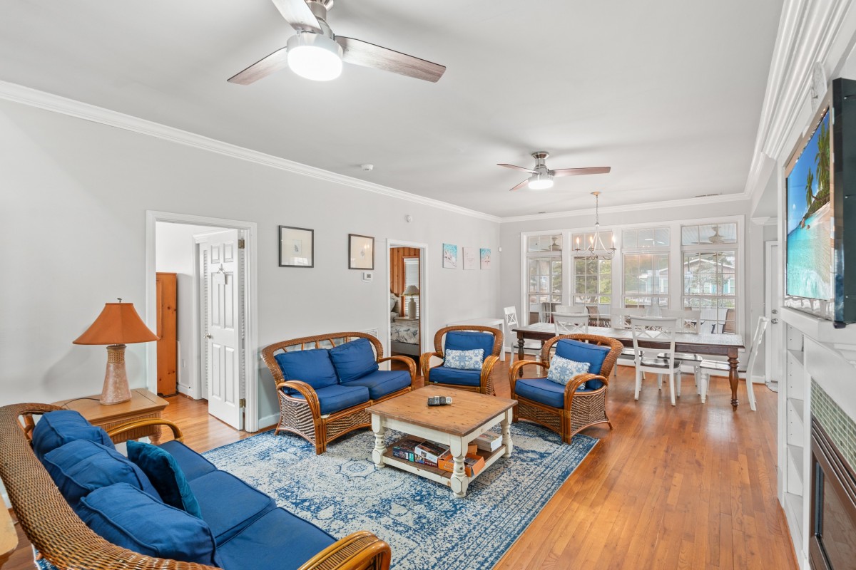 Inside this inviting Myrtle Beach vacation rental is a fully furnished kitchen, comfortable living room, electric fireplace for your indulgence, and WIFI for your convenience. Flatscreen TVs, ceiling fans, and even a washer and dryer are part of the Myrtle Beach vacation package at Happy Starfish.